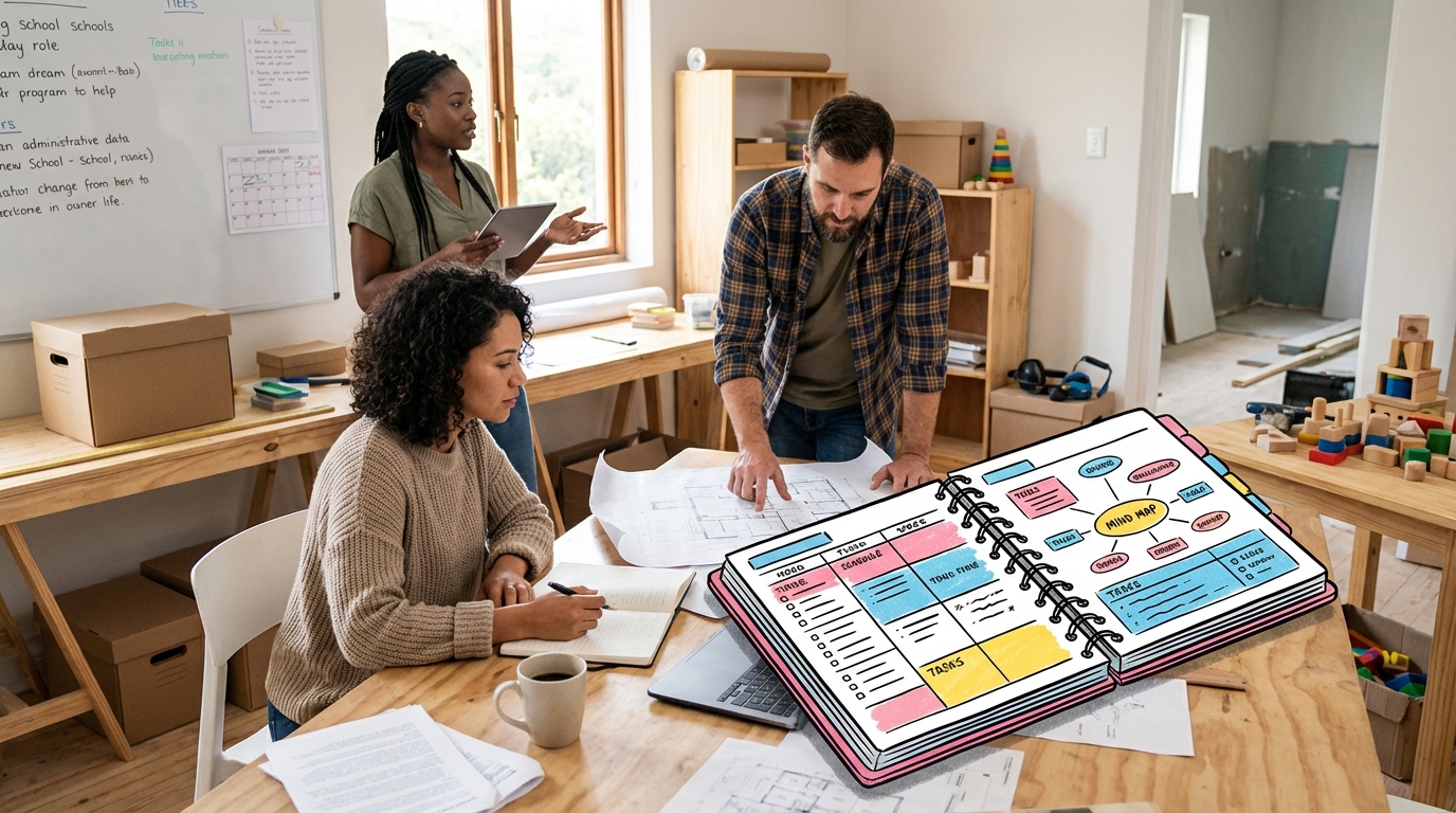 Quand on crée et dirige une école Montessori, les horaires ne se limitent pas aux heures de classe. Une grande partie du travail se fait en amont, en parallèle, et souvent “hors cadre” : recherche de locaux, travaux, rendez-vous, recrutements, gestion des urgences.